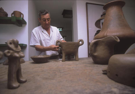 >> El trabajo del barro en Lanzarote, con una amplia gama de objetos que incluye reproducciones de objetos aborígenes, ollas, tarros, figuras..., tiene una merecida reputación en el resto de Canarias por la notable calidad de sus trabajos. Para este prestigio ha sido determinante, junto a la belleza de sus diseños, el que buena parte de la cerámica siga la tradición aborigen del urdido, que prescinde del uso del torno en la elaboración de las piezas. El núcleo de creación alfarera más importante fue El Mojón, luego trasladado a Muñique. De este núcleo la figura más destacada era la de Dorotea Armas, ya desaparecida, que ayudó a transmitir las viejas técnicas. El trabajo del barro de tradición aborigen se realiza a base de “churros” o cordones gruesos de barro, y aún se mantiene en otras Islas y en el Norte de África. Se comienza ahuecando un trozo de barro al que se da forma hasta conseguir el fondo, y luego se forma la pieza con los churros de barro, que se añaden con una mano mientras que con la otra se hace girar la pieza. En algunas piezas se puede encontrar el añadido del almagre para realzar el tono rojo de la pieza e impermeabilizarla, o bien el de un engobe que proporciona cierto color amarillento. Cuando se acaba la pieza se introduce en el horno, aunque antes se cocía en una simple hoguera. En la actualidad se utiliza también el horno, cuyo uso no menoscaba la calidad de los diseños, que abarcan desde reproducciones aborígenes hasta ceniceros. |